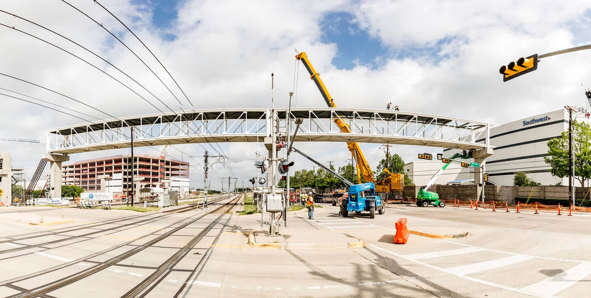 The bridge spans four lanes of Denton Drive, two DART train tracks, one DGNO railroad track, and two lanes of Wyman Street. The coordination required to shut down and work in (and over) the DART, DGNO and the City R.O.W. presented a very unique set of challenges for our field team.